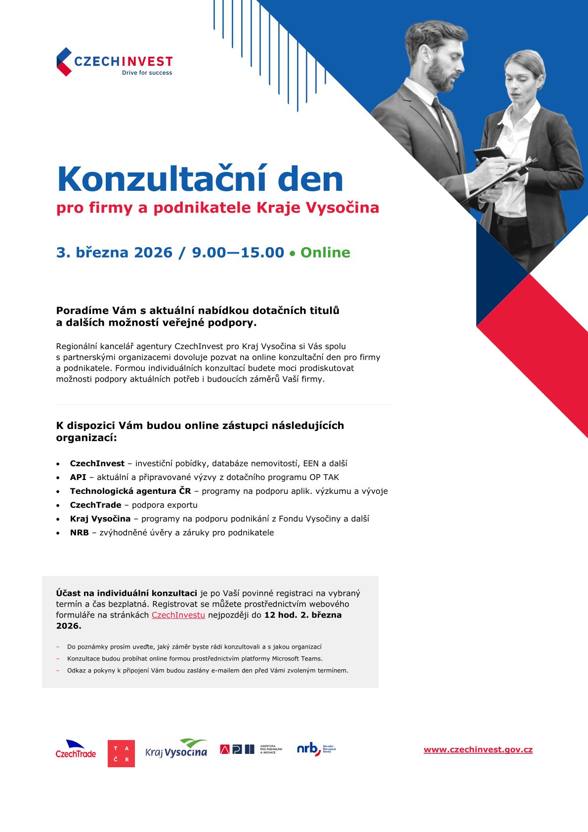 Rádi bychom vás pozvali na ONLINE konzultační den pro firmy a podnikatele Kraje Vysočina, který pořádá agentura CzechInvest.