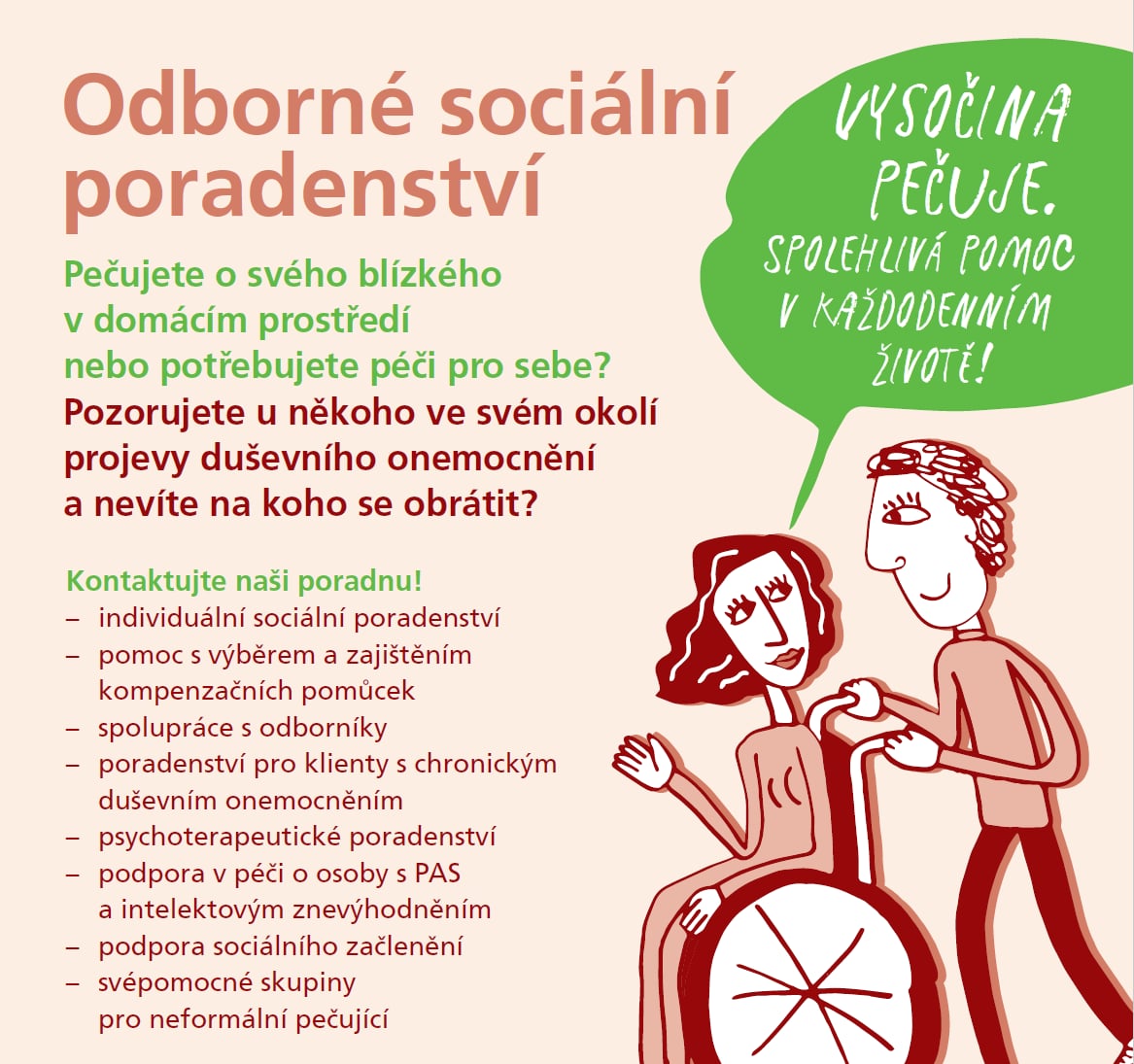 Bezplatná Poradna Vysočina pečuje Pro všechny pečující je trvale otevřena poradna, která nabízí odborné sociální poradenství i psychoterapeutickou pomoc. Poradnu můžete kontaktovat: