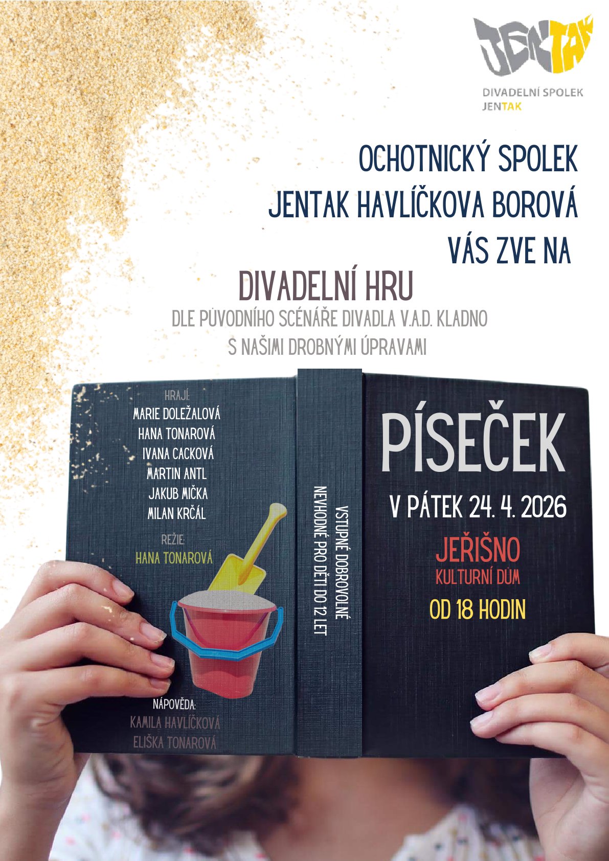 přijměte srdečné pozvání na divadelní představení PÍSEČEK, se kterým do nedalekého Jeřišna zavítá ochotnický spolek JENTAK z Havlíčkovy Borové. Přijďte si užít večer plný skvělých hereckých výkonů v přátelské atmosféře Kulturního domu v Obec Jeřišno | oficiální FB stránky.