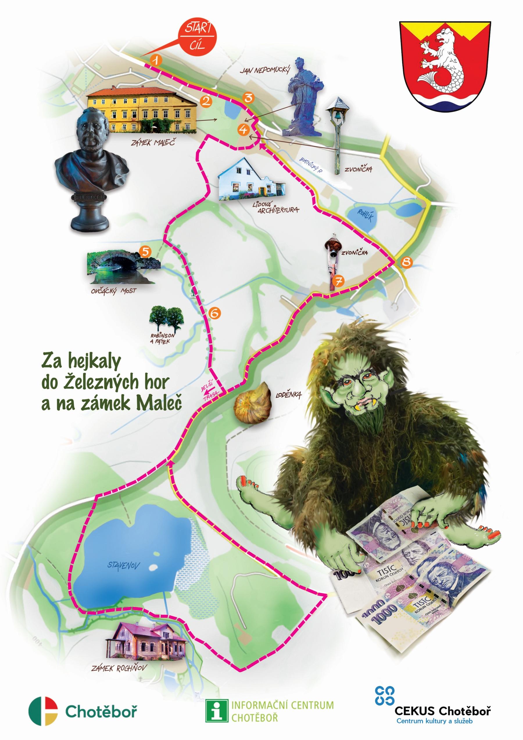 Odkaz na příběh, úkoly a mapu naleznete zde https://www.veldo.cz/vylety-s-tajenkou/vylet-za-hejkaly-do-zeleznych-hor-a-na-zamek-malec